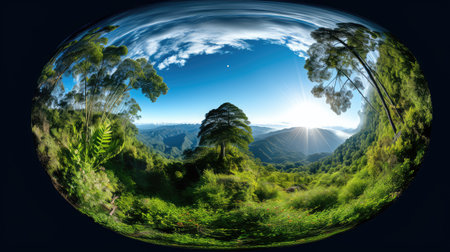Tall tree with sun light in the forest in glass ball effect with black and white image style background.