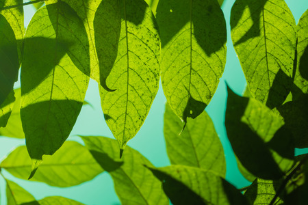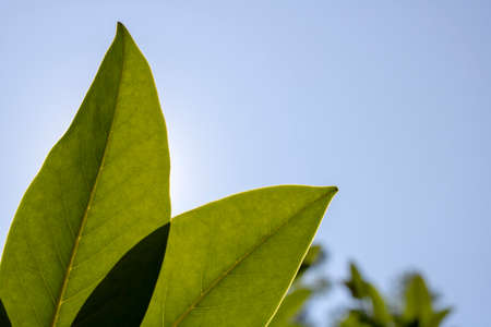 Close Up green leaf under sunlight in the garden. Natural background with copy space.