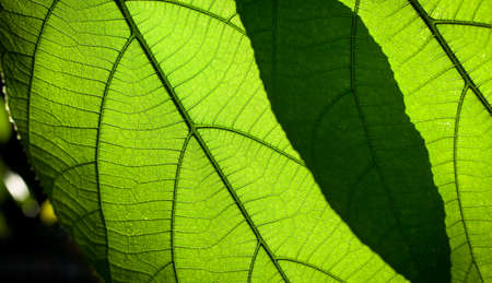 Closeup of portion of green netted veins leaf, reticulate venation of green leave with light.