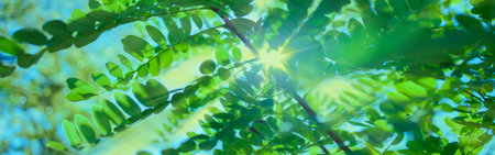 Acacia leaves in the sunlight . Fresh green leaves with rays
