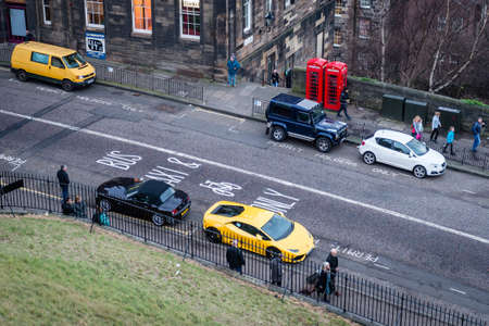 Edinburgh, Scotland - December 30, 2016: People are walking on the street of Edinburgh. View from the Castlehill in Scotland, UK