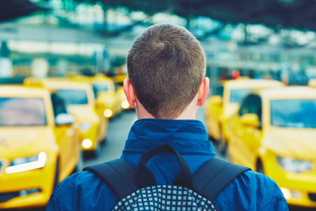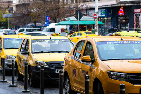 Car in traffic, modern city taxi service. Taxi cars parked at the taxi station in the capital city of Bucharest, Romania, 2020