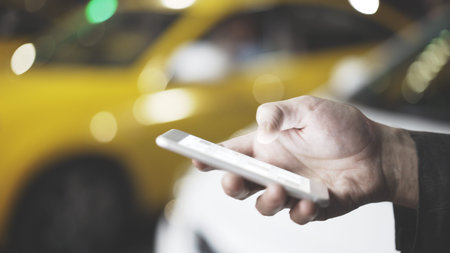 Male hand with smartphone on blurred road background. Taxi service. Night city.