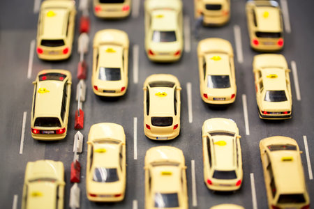 Urban taxi and delivery service concept. Toy yellow taxi car model. Copy space for text, banner.