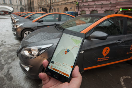 Saint-Petersburg, Russia - January 30, 2017: cars-sharing - the opening of a new service car rental per minute. Search free car parking with the mobile app