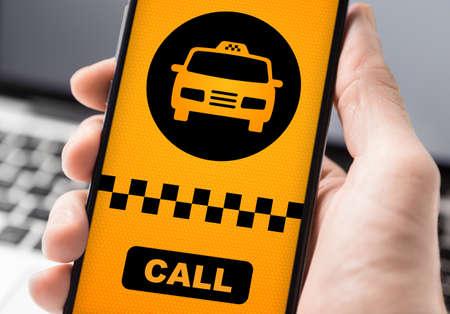 Closeup view of female hand holding smartphone with taxi app interface, ordering car at work, using mobile service, booking cab, making call, office table with laptop in the background