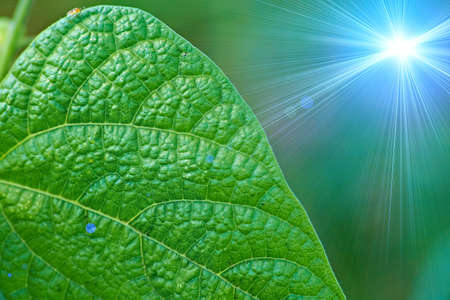 green leaves on blue sky background with sun rays and lens flare effect