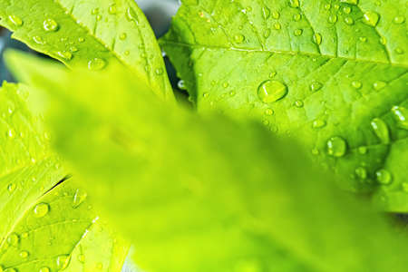 Macro closeup of Beautiful fresh green leaf with drop of water after the rain in morning sunlight nature background.