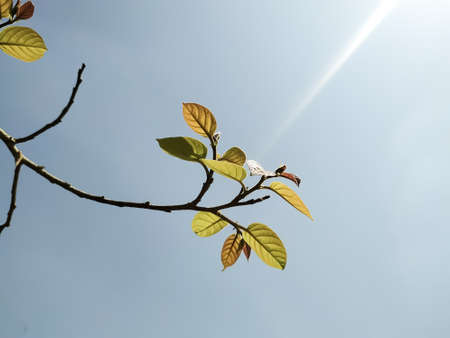 Bunchosia armeniaca green leaves with blue sky background, selected focus.