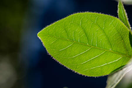 Macro shot of a green leaf on a blue background with copy space