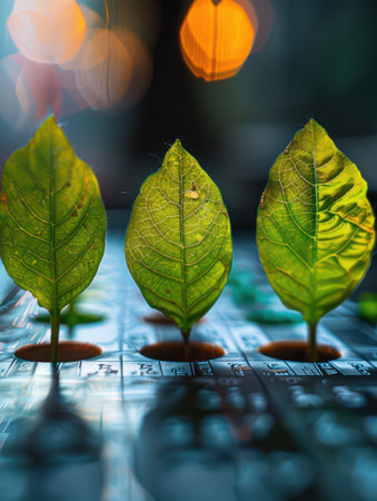 A symphony of nature and technology, vibrant green leaves bathed in warm bokeh lights This captivating image captures the beauty of the natural world interwoven with the rhythmic pulse of modernization, creating a visually stunning composition AI Generative