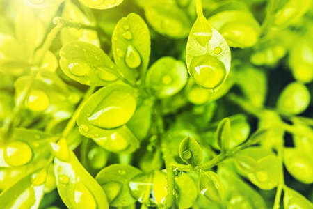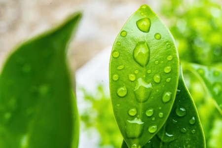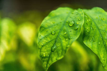Macro closeup of Beautiful fresh green leaf with drop of water after the rain in morning sunlight nature background.