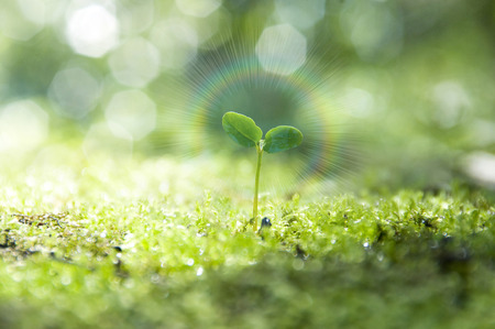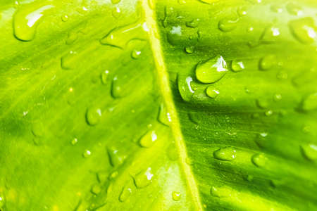 The rainwater drops cover the green leave with the sunlight shining from above, to go green, save energy and environmental friend concept