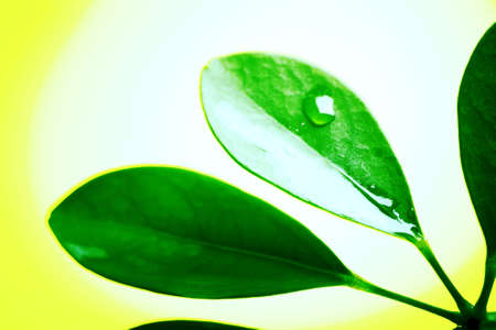 Macro closeup of Beautiful fresh green leaf with drop of water in morning sunlight nature background.