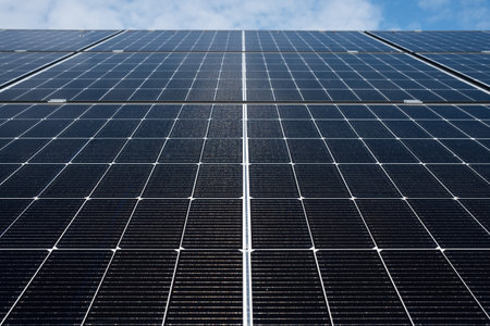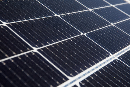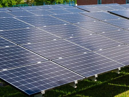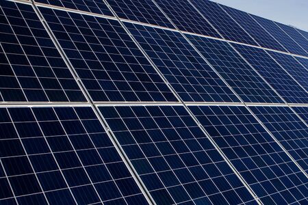 Solar panel texture. Environmental technology. Green eco power supply background. Electrical cell generating current. Renewable sources of energy. Photovoltaic panels pattern.