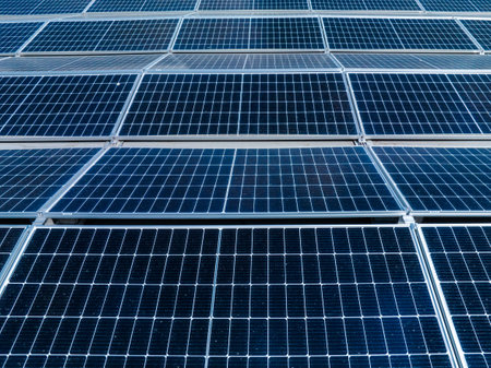 Aerial view of large sustainable electrical power plant with rows of solar photovoltaic panels for producing clean ecological electric energy. Renewable electricity with zero emission concept