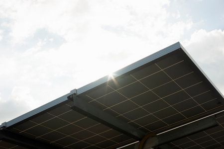 Solar panels against the sunshine, Bright Sunny Day, Solar Farm in rural, Eco-environmentally friendly green energy of sustainable development, Alternative power energy concept.