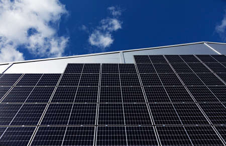 Solar panels stands in row on the roof . Free electricity for home. Sustainability of planet. Green energy. Solar cells power plant business. Ecological clean energy. Blue panels on the ground.