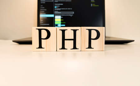php inscription on wooden cubes on a table with white desk
