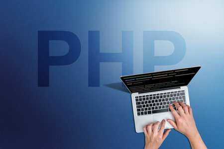 Programming language php code with person and laptop.