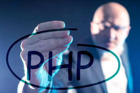 PHP. A Man writes the word PHP on a glass screen. Programming training. Writing computer programs. Web and application development concept.