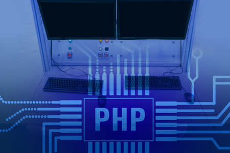 PHP logo on the background of computers. Hypertext preprocessor. Software development. PHP letters simulate a printed circuit Board. Computer language.