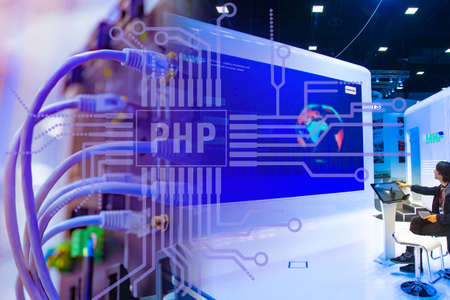 PHP. Exhibition of computer equipment. Network equipment next to the PHP logo. Concept - guy controls the monitor at the exhibition. Concept - a conference for Internet engineers. Programming.