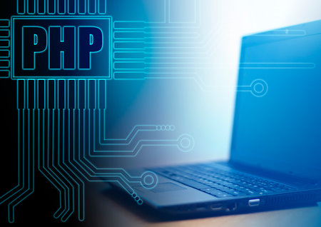 PHP logo next to a laptop. The lines emit a computer board. Concept - PHP coding. Concept - freelance developer. Programming in Personal Home Page. Computer Application Development. Testing