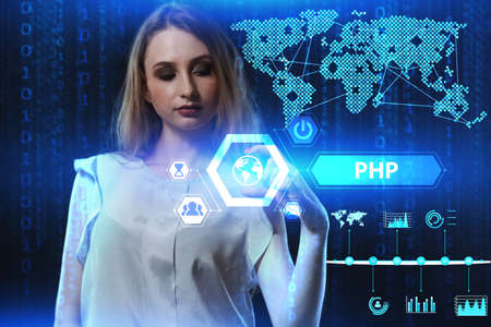 The concept of business, technology, the Internet and the network. A young entrepreneur working on a virtual screen of the future and sees the inscription: PHP