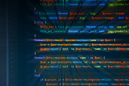 PHP language web programming source code. Abstract code background. Backend programming, software development concept background