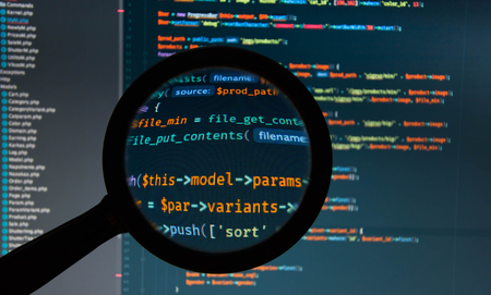 Php code under loupe on the screen of laptop close-up