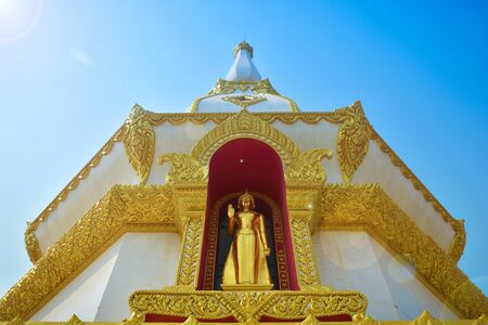 Buddha statue buddha image used as amulets of Buddhism religion in Thailand. Standing golden Buddha and the blue sky. (Top View)