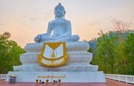 PAI, THAILAND - MAY 7, 2019: The huge White Buddha Image in Touching Earth (Earth Witness) gesture, sitting on carved lotus-throne on the mountain top, Wat Phra That Mae Yen temple, on May 7 in Pai, Thailand