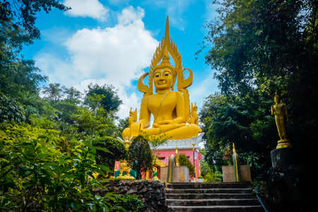 Phatthalung, Thailand - April 8, 2019: A huge golden Buddha statue on the territory of the temple in Phatthalung in Thailand