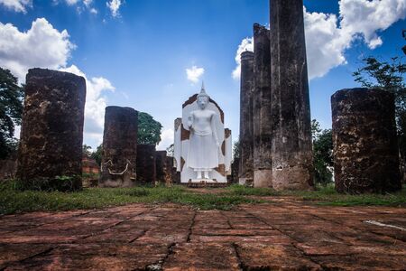 Sculpture about Buddha image is Buddha posture sit on base and feel happy on sky background.