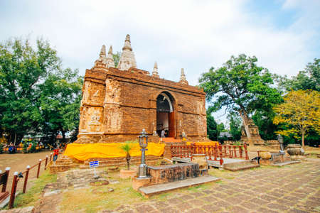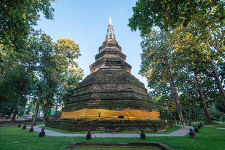 Old brick stupa of Wat or temple Chedi Luang Chiang saen, Chiang rai Thailand.