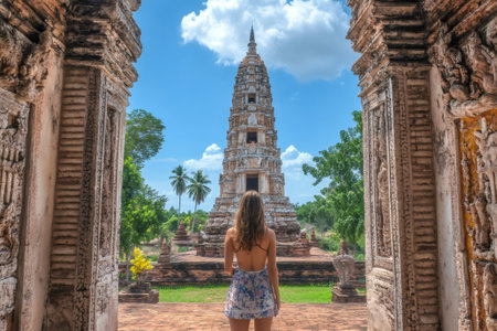 Tourist admiring the ancient ruins of Wat Phra Sri Rattana Mahathat in Lopburi, Thailand, a famous landmark in Southeast Asia