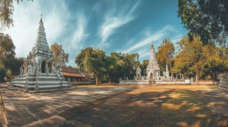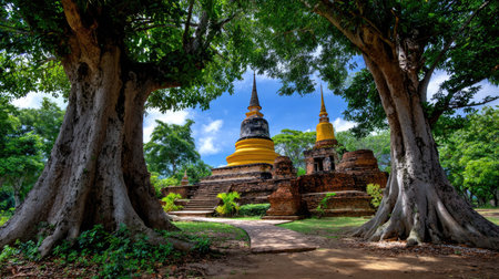 Beautiful scene of an ancient Buddhist temple framed by towering trees under a bright blue sky, reflecting Thailand's rich cultural heritage and serene atmosphere.