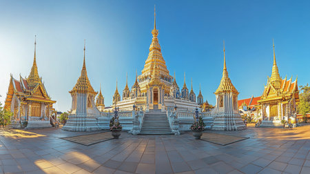 A panoramic view of the Phra Maha Chedi Chai Mongkol temple, showcasing its intricate design and golden spires against a clear blue sky.