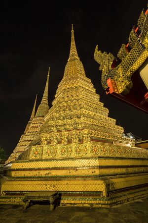 The stupas of the temple of the reclining Buddha Wat Pho, decorated with multi-colored ceramic mosaic. Night photography.