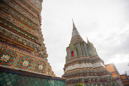 The art of buildings and many ornate chedis at the Wat Pho temple in Bangkok during a sunny day . landmark of Thailand.