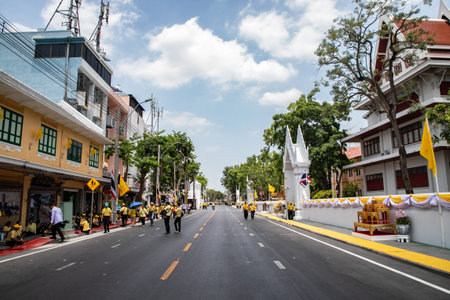Thai people wear yellow shirts and are waiting for His Majesty King Maha Vajiralongkorn Bodindradebayavarangkun or King Rama X, near Phra Sumen Road, Bangkok, Thailand