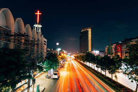 BANGKOK, THAILAND - APRIL 25: The traffic light trails on the street of Bangkok at night on April 25, 2016 in Bangkok, Thailand.