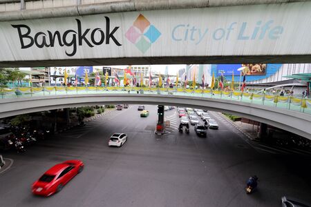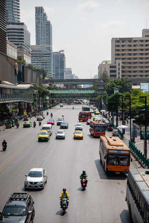 Bangkok, Thailand. - May 21, 2016 : Traffic at road in the city center. near interchange skywalk to transit between Sky Transit (BTS) and Bus Rapid Transit (BRT) at Chong Nonsi, Bangkok, Thailand.
