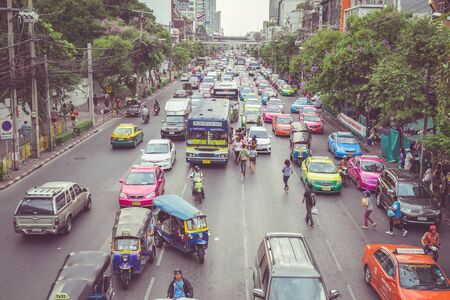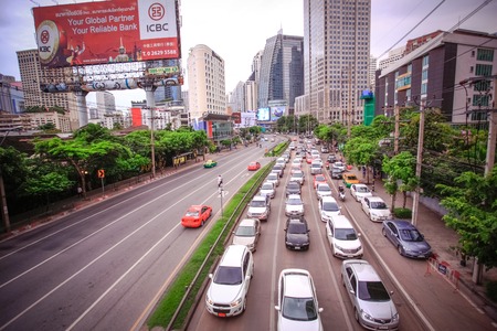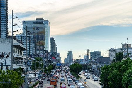 Bangkok - June 10, 2015: Traffic moves slowly along a busy road on June 10, 2015 in Bangkok, Thailand. Annually an estimated 150,000 new cars join the already heavily congested streets of Bangkok.