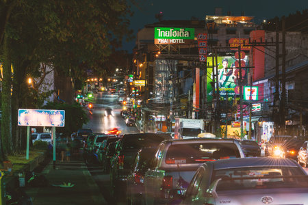 Thailand Krabi 6 MAR 2020 Street life and night concept. Central street in Krabi resort at night. Moving objects is in motion blur due to long exposure