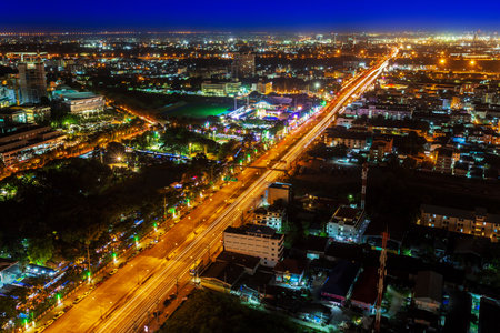 Aerial view of night modern city with light trails on the highway from the traffic. Bangkok, Thailand