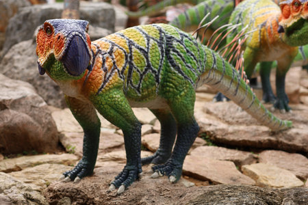 Close up of a stegosaurus dinosaur with open mouth. Dinosaur in the zoo.