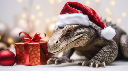 Close up of lizard's head on wooden surface with blurry background. Generative AI.