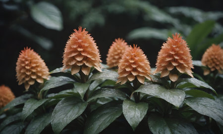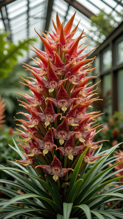 Exotic tropical flower in greenhouse with vibrant red spikes and lush green leaves. That the image is generated using AI.